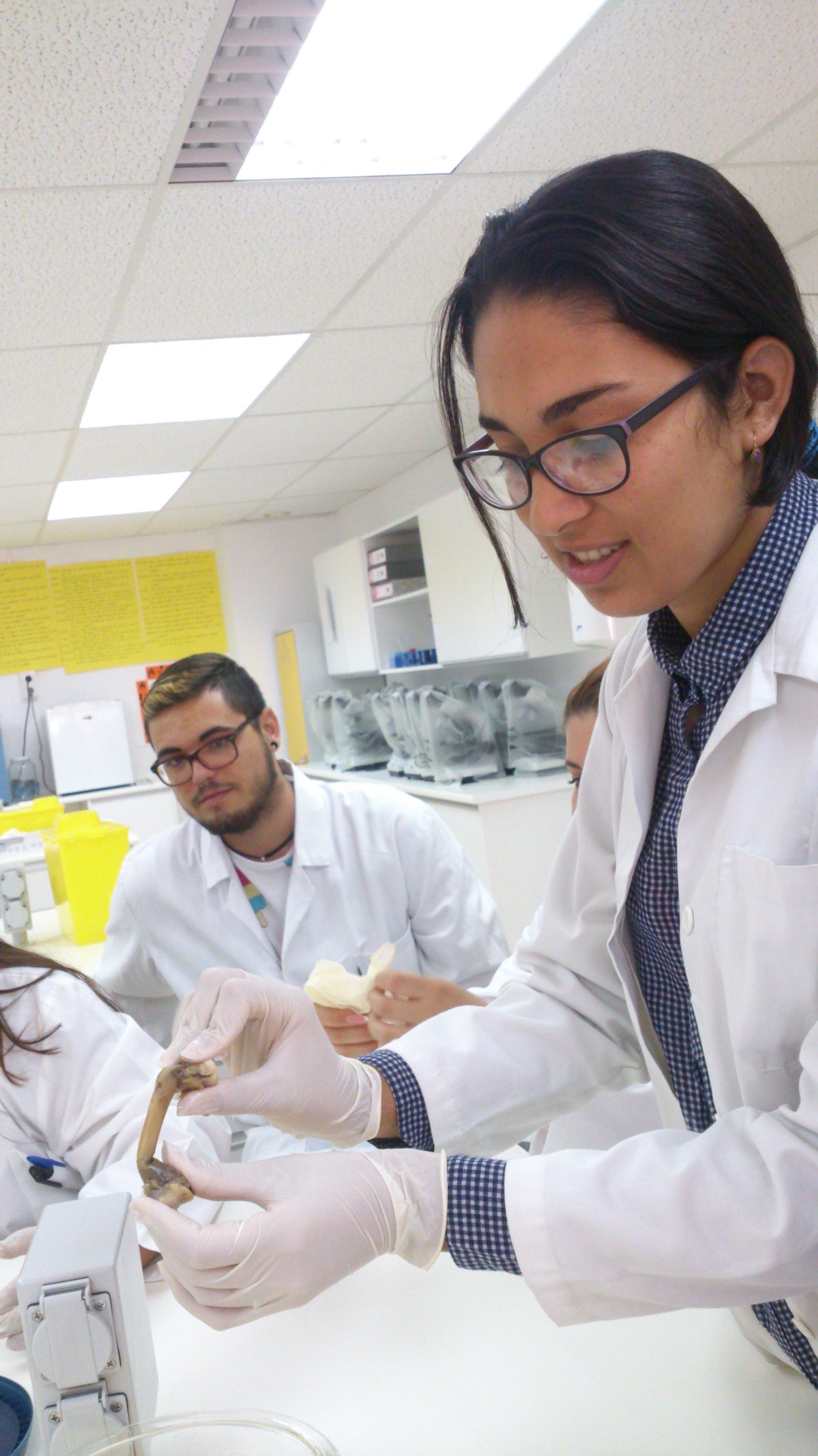 Los alumnos de primer curso de anatomía Patológica y Citodiagnóstico han realizado un experimento para comprobar las propiedades físicas del tejido óseo. En concreto, ver qué sucede cuando al hueso se le elimina el fosfato cálcico que le confiere su dureza.