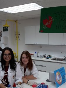 Aquí las alumnas extraen el ADN de las fresas, a través de una mezcla de sal y detergente, se pueden observar las hebras de ADN de las fresas.